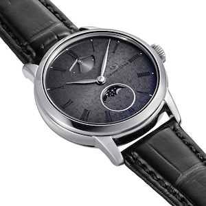 ・特長:ムーンフェイズ(月齢修正用器具付)、パワーリザーブ表示、シースルーバック、20石