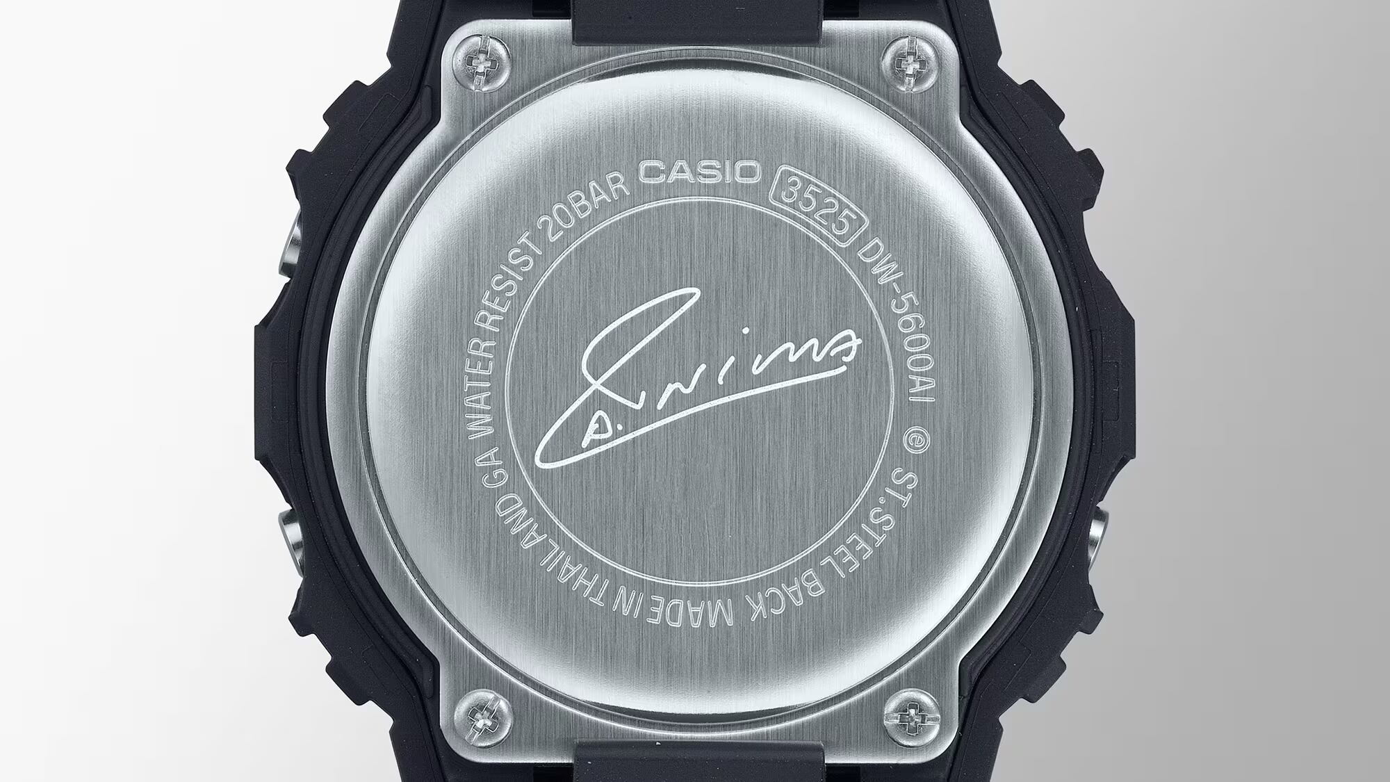 ベースモデルにG-SHOCKを代表するDW-5600を採用。ベースカラーのブラックにイメージカラーであるレッドを随所にあしらい、バンドにはイニエスタ選手を象徴するワード、‘’Master the game‘’の直筆をプリント。遊環にはオリジナルのロゴ、バックライトにはイニエスタ選手のシルエットが浮かび上がる仕様にしました。また、8時側のサイドボタンには背番号8をレーザー刻印し、ディテールを随所に取り込みました